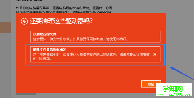 6.接着继续出现提示页面,询问 还要清理这些驱动器吗? 建选择第二项 删除文件并清理驱动器 ,耐心等待重置完成即可。