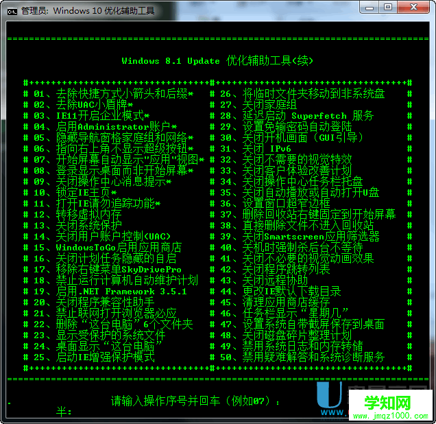 html' target='_blank'>windows10的系统优化批处理工具,具有50个优化项目,几乎涵盖所有的win10优化的类别,比如禁用休眠,检查更新而不自动更新等,功能很全面,适合才安装了win10的原版系统的朋友使用,不用手动去找这些需要优化的项目,只需要选择某一项让程序自动帮你完成,这样就不需要专业的技术知识也可以达到优化的目的,另外它还隐藏有win8的优化功能。