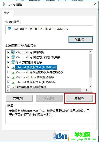 4、接下来点击internet协议版本 4 (TCP/IP),选择属性;
