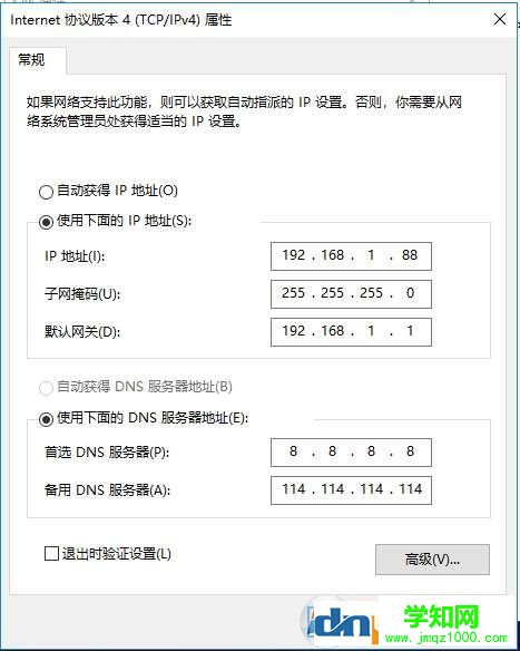 5、然后选择使用下面的IP地址,默认网关填路由器IP地址,以太网IP需要和网关在同一网段,DNS可以选择常用的。如8.8.8.8(谷歌) 114.114.114.114(国内移动、电信和联通通用的DNS)