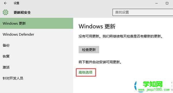 2、调出更新和安全的设置窗口后,我们点击windows更新下的高级选项,如图所示: