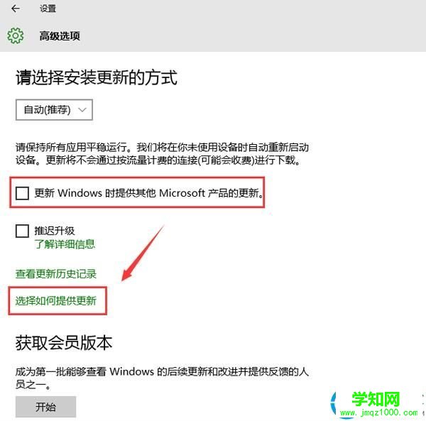 3、接着先取消勾选“更新windows时提供其他microsoft产品的更新”,再点击“选择如何提供更新”,如图所示: