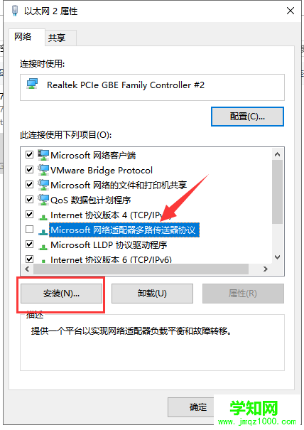 2、选中Microsoft网络适配器多路传送器协议,点击安装