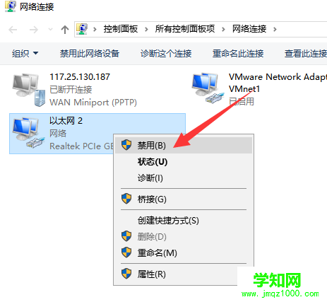3、右击现在正在使用的网络,选择禁用,等待一会再重新启用。