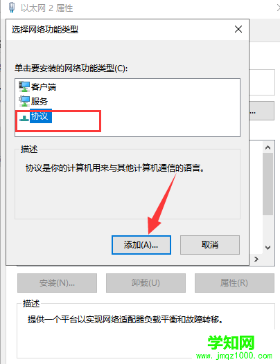 5、选择协议,点击添加。重启电脑,等待20分钟尝试打开网页