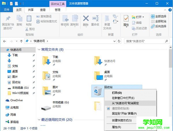 此时可以看到回收站已经出现在了“快速访问”中。如果想恢复默认状态,只需在“快速访问”中的回收站图标上点击右键,选择“从‘快速访问’取消固定”即可