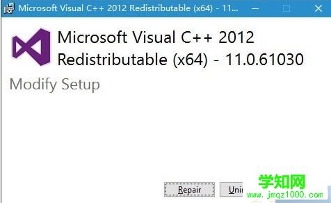 2、你也可以点此下载Visual C++ 2012 Redistributable安装包,运行安装程序,然后选择修复即可