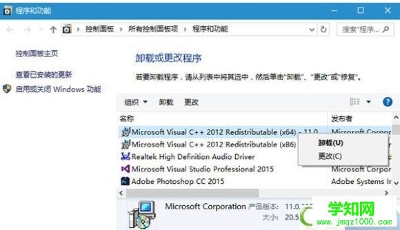 1、右键单击开始按钮——程序和功能,找到Microsoft Visual C++ 2012 Redistibutable(X64) - 11.0.61030或Microsoft Visual C++ 2012 Redistributable (X86) - 11.0.61030,右键单击,选择“更改”。