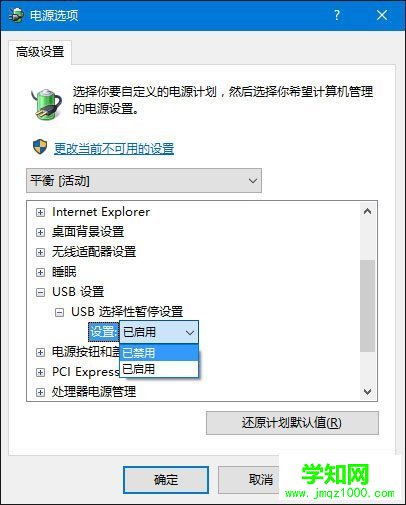 展开USB设置—USB选择性暂停设置,将其设置为“已禁用”,确定。
