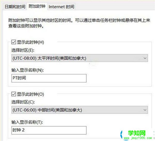 3.在「附加时钟」中勾选「显示此时钟」再选择需要的时区即可,为虽然只能附加2个时钟,但还是可以「输入显示名称」以便区分。