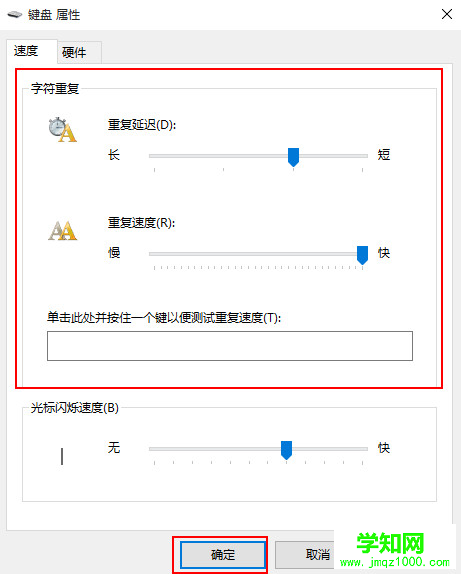 4、在 键盘属性 页面中,便可以根据自身的情况来做调节,点击确定即可。