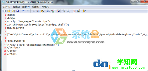 我们还可以利用网页的文件(.htm)解锁注册表。如图示在记事本中这样输入后另存为扩展名为htm的文件,运行就ok了。