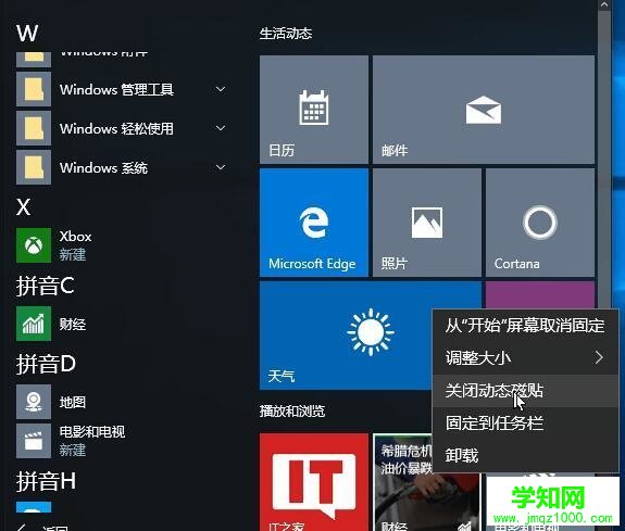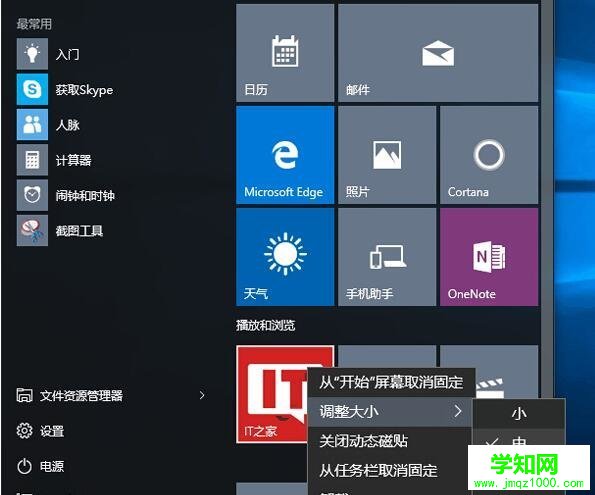 调整动态磁贴尺寸的方法为:右键单击动态磁贴—》调整大小—》选择合适的大小即可。