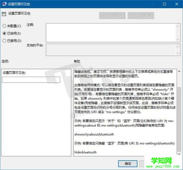 示例:若要指定只隐藏“蓝牙”页面(其URI为ms-settings:bluetooth):