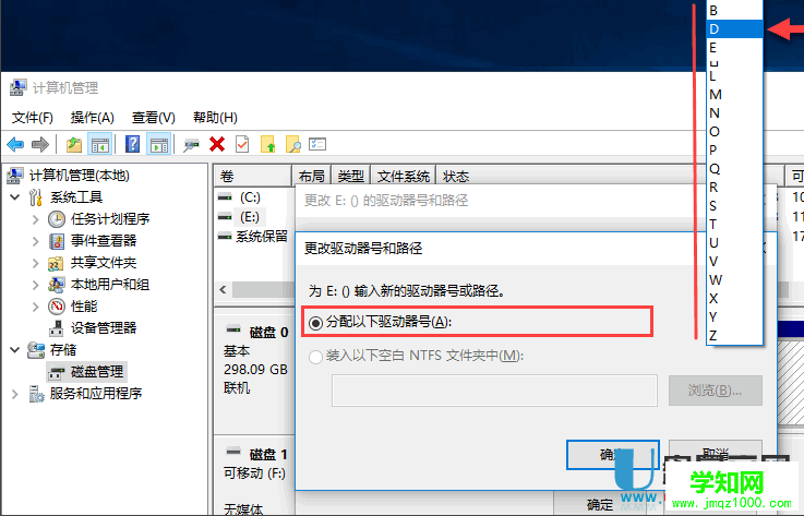 5、在 分配以下驱动器号 选项后面的框里点一下,就会出现全部未用的驱动器号,可以看到什么D E M N O都在,我们这里当然是选D了,因为就是D盘变成了E盘,相当于改回正常,然后点确定。