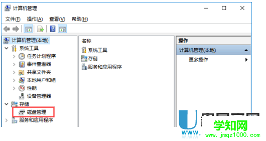 2、第二步就是就是点左半边窗口里的 磁盘管理 选项,点后就会在右边出现电脑里所有硬盘的状态