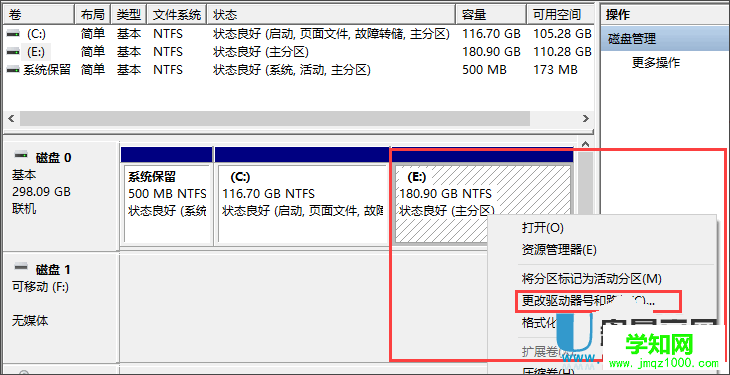 3、这一步就是关键了,选中你要修改盘符的分区,这里要改的是E盘,选中后点鼠标右键会弹出菜单,然后点菜单里的 更改驱动器号和路径