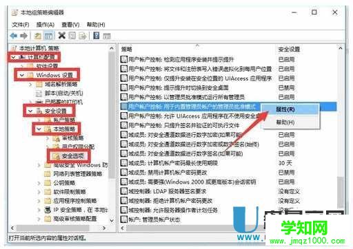 2、然后会弹出新窗口 组策略 ,依次展开 计算机管理 - Windows设备 - 安全设置 - 本地策略 - 安全选项 项,在右侧找到 用户账户控制:用于内置管理员账户的管理员批准模式 项并右击,从其右键菜单中选择 属性 项。