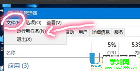 如果没有自动重启,我们可以手动重启,点击左上角 文件(F) 的 运行新任务 ,输入explorer.exe再点击确定,就可以了。