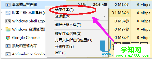 3、右击 桌面窗口管理器 ,选择 结束任务 选项。