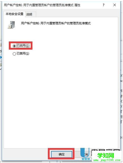 3、然后鼠标左键选择 用户账户控制:用于内置管理员账户的管理员批准模式 的属性,在新出的属性窗口里勾选 已启用 项,点击 确定 按钮。如图所示: