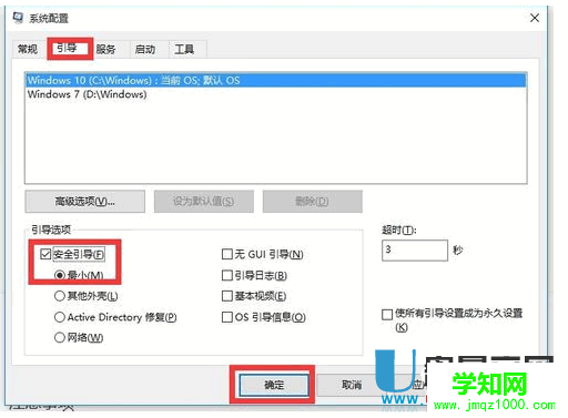 2、在新 系统配置 窗口中,切换到 引导 选项卡,勾选 安全引导 项,点击 确定 按钮,并重启一下计算机进入安全模式,如下图。