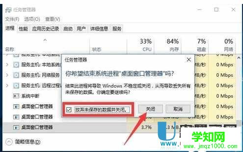 4、此时将弹出如图所示的 任务管理器 警告窗口,在此直接勾选 放弃未保存的数据并关闭 项,点击 关闭 按钮。
