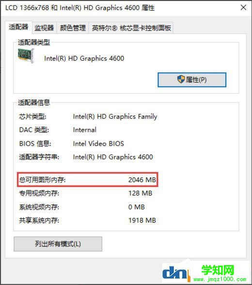 5、点击【显示适配器属性】功能选项,进入显卡属性对话窗口,在该窗口即可查看显卡显存的大小了。