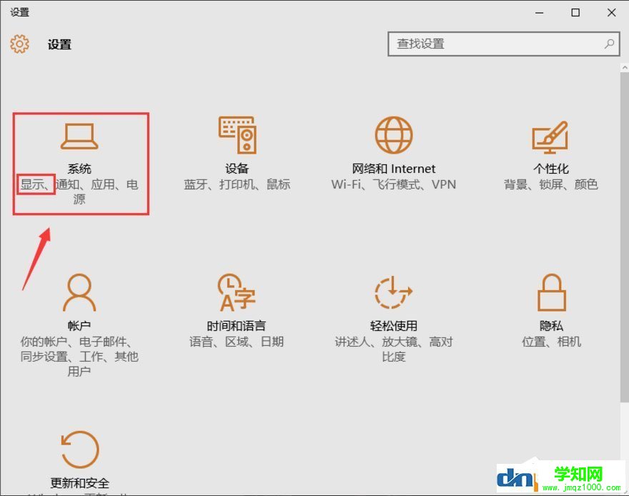 2、点击下拉菜单里的【设置】选项,进入Win10设置对话窗口,在设置选项里找到【系统】功能选项,该选项下有【显示】功能按钮;