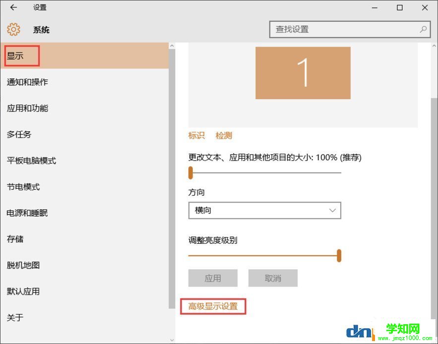 3、点击【系统】功能选项进入系统设置界面,在左侧菜单栏里选择【显示】,并下拉该界面,找到【高级显示设置】功能选项;
