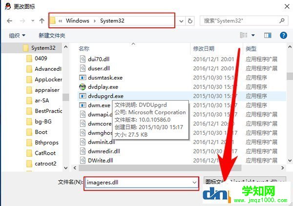 Win10修改桌面快捷方图标步骤方法 第七步,在系统中找到一个图标文件,比如打开“C:WindowsSystem32imageres.dll”就可以看到很多系统图标。