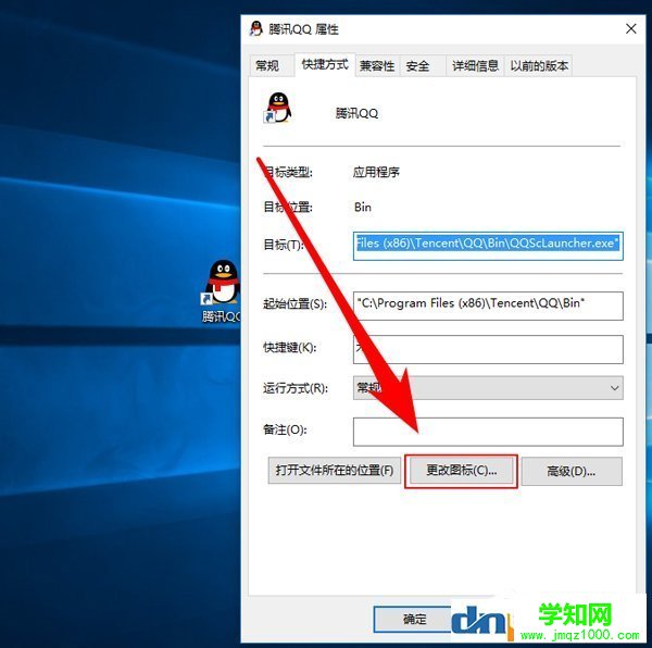 Win10修改桌面快捷方图标步骤方法 第五步,在快捷方式栏目中,单击“更改图标”。