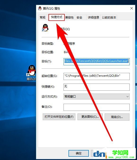 Win10修改桌面快捷方图标步骤方法 第四步,在属性提示框中,打开“快捷方式”的tag。
