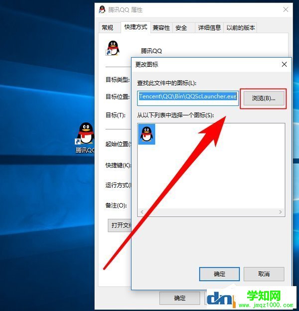 Win10修改桌面快捷方图标步骤方法 第六步,在更改图标的提示框中选择“浏览”。