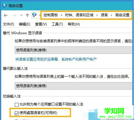 一,首先我们同时按Win+X,打开控制面板,然后点一下时钟、语言和区域,用鼠标点击语言,最后选择高级设置,勾选 使用桌面语言栏 ,保存。来确保在控制面板中已经选中了 使用桌面语言栏 。