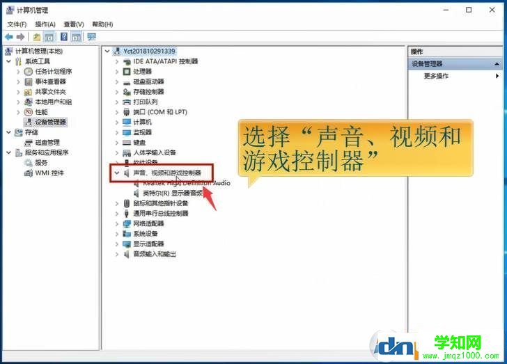 5、接下来点击列表左边“设备管理器”,在右边选择“声音、视频和游戏控制器”; 选择声音设备。