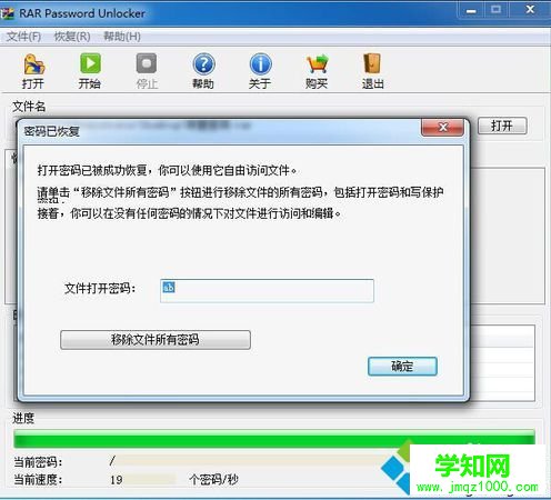 7、密码破解成功后会弹出窗口,提示密码已被成功恢复,并显示文件打开密码,此时可以选择清除密码或者修改密码。
