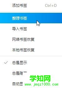 1、在QQ浏览器中点击菜单按钮,点击“书签”,在弹出的菜单中点击“整理书签”,如图: