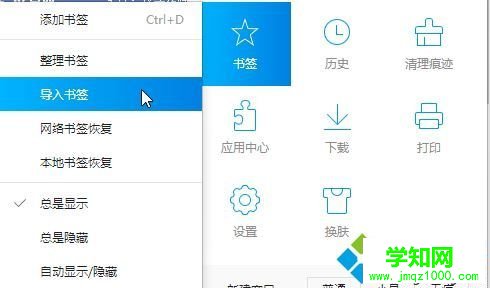 4、当我们要恢复书签的时候只需点击菜单栏- 书签 - 导入书签;