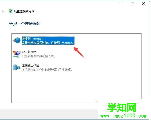 继续选择 设置新的连接和网络 ,进入之后会弹出一个选择列表框框。连接选项有 连接到internet 、 设置新网络 、 连接到工作区 ,直接选择 连接到internet ,点 下一步 。如图1-2所示。