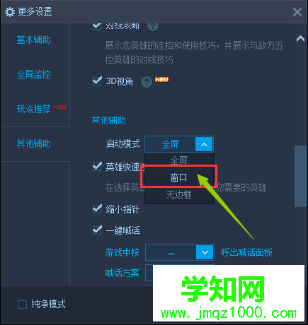 4、然后再从上方找到启动模式,从右边找到向下的箭头,点开以后,找到窗口模式并选择,然后将游戏重启(一定要通过TGP重启才能开启窗口模式),重启后,你会发现鼠标指针会重新现身的(适用于部分用户);