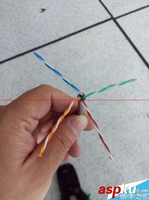 5、将双绞线按照568B接法,紧密排列在一起,并且要求末端到中端很直,顶端因为后面要剪掉,稍弯点无防。568B接法是:白橙、橙、白绿、蓝、白蓝、绿、白棕、棕。