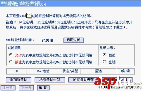 通过有线登陆路由器管理界面,“无线参数(无线设置)”-“MAC地址过滤”,确认其为关闭状态。