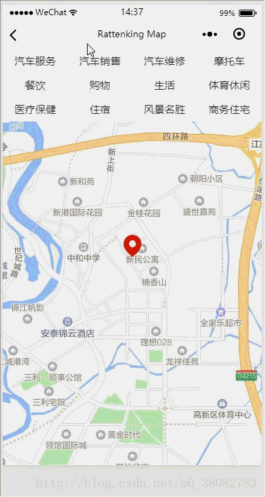 var app = getApp();var amap = app.data.amap;var key = app.data.key;Page({ data: { aroundList: [ { name: '汽车服务', id: '010000' }, { name: '汽车销售', id: '020000' }, { name: '汽车维修', id: '030000' }, { name: '摩托车', id: '040000' }, { name: '餐饮', id: '050000' }, { name: '购物', id: '060000' }, { name: '生活', id: '070000' }, { name: '体育休闲', id: '080000' }, { name: '医疗保健', id: '090000' }, { name: '住宿', id: '100000' }, { name: '风景名胜', id: '110000' }, { name: '商务住宅', id: '120000' } ], status:null, latitude: null, longitude: null, isShow: false, markers: [], points: [], location: '', name:'', address: '' }, onLoad: function () { // 页面加载获取当前定位位置为地图的中心坐标 var _this = this; wx.getLocation({ success(data) { if (data) { _this.setData({ latitude: data.latitude, longitude: data.longitude, markers:[{ id:0, latitude: data.latitude, longitude: data.longitude, iconPath: '../../src/images/ding.png', width: 32, height: 32 }] }); } } }); }, getType(e) {//获取选择的附近关键词,同时更新状态 this.setData({ status: e.currentTarget.dataset.type}) this.getAround(e.currentTarget.dataset.keywords,e.currentTarget.dataset.type); }, getAround(keywords,types) {//通过关键词获取附近的点,只取前十个,同时保证十个点在地图中显示 var _this = this; var myAmap = new amap.AMapWX({ key: key }); myAmap.getPoiAround({ iconPath: '../../src/images/blue.png', iconPathSelected: '../../src/images/ding.png', querykeywords: keywords, querytypes: types, location: _this.data.location, success(data) { if (data.markers) { var markers = [], points = []; for (var value of data.markers) { if (value.id > 9) break; if(value.id == 0){ _this.setData({ name: value.name, address: value.address, isShow: true }) } markers.push({ id: value.id, latitude: value.latitude, longitude: value.longitude, title: value.name, iconPath: value.iconPath, width: 32, height: 32, anchor: { x: .5, y: 1 }, label: { content: value.name, color: 'green', fontSize: 12, borderRadius: 5, bgColor: '#fff', padding: 3, x: 0, y: -50, textAlign: 'center' } }); points.push({ latitude: value.latitude, longitude: value.longitude }) } _this.setData({ markers: markers, points: points }) } }, fail: function (info) { wx.showToast({title: info}) } }) }}); 1. 由于是移动端,所以人为限制只显示了9条周边数据,防止重叠部分太多。