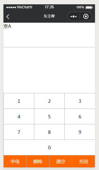 Page({ data: { licensePlateShowHidden:true, licensePlate_provinces_Box:true, licensePlate_letter_Box: true, licensePlate_digital_Box: true, licensePlate_provinces: [ "京", "沪", "浙", "苏", "粤", "鲁", "晋", "冀", "豫", "川", "渝", "辽", "吉", "黑", "皖", "鄂", "津", "贵", "云", "桂", "琼", "青", "新", "藏", "蒙", "宁", "甘", "陕", "闽", "赣", "湘" ], licensePlate_letter: [ "A", "B", "C", "D", "E", "F", "G", "H", "L", "J", "K", "L", "M", "N", "O", "P", "Q", "R", "S", "T", "U", "V", "W", "X", "Y", "Z" ], licensePlate_digital: [ "", "", "", "", "", "", "", "", "", "" ], LicensePlateNumber:'', }, // 显示模拟键盘 LicensePlateNumber:function(){ var that = this; var LicensePlateNumber = this.data.LicensePlateNumber; var LicensePlateNumberLen = LicensePlateNumber.length; console.log(LicensePlateNumber, LicensePlateNumberLen) if (LicensePlateNumberLen == ){ this.setData({ licensePlateShowHidden: false, licensePlate_provinces_Box: false, }) } else if (LicensePlateNumberLen == ){ this.setData({ licensePlateShowHidden: false, licensePlate_letter_Box: false, }) }else{ this.setData({ licensePlateShowHidden: false, licensePlate_digital_Box: false, }) } }, // 切换成字母 licensePlate_switchLetter:function(){ this.setData({ licensePlate_provinces_Box:true, licensePlate_letter_Box:false, licensePlate_digital_Box: true, }) }, // 切换成数字 licensePlate_switchDigital: function () { var LicensePlateNumber = this.data.LicensePlateNumber; var LicensePlateNumberLen = LicensePlateNumber.length; if (LicensePlateNumberLen == ){ wx.showToast({ title: '车牌号码第二位必须是字母', icon: 'none', duration: , }) }else{ this.setData({ licensePlate_provinces_Box: true, licensePlate_letter_Box: true, licensePlate_digital_Box: false, }) } }, // 删除 licensePlate_delete: function (e) { var LicensePlateNumber = this.data.LicensePlateNumber; var LicensePlateNumberLen = LicensePlateNumber.length; var LicensePlateNumberDelete = LicensePlateNumber.split(''); var NewLicensePlateNumber = LicensePlateNumberDelete.join('').slice(,-) if (LicensePlateNumberDelete.slice(,-).length == ){ this.setData({ licensePlate_provinces_Box: true, licensePlate_letter_Box: false, licensePlate_digital_Box: true, }) } else if (LicensePlateNumberLen == || LicensePlateNumber == '' || LicensePlateNumberDelete.slice(, -).length == ){ this.setData({ licensePlate_provinces_Box: false, licensePlate_letter_Box: true, licensePlate_digital_Box: true, }) } this.setData({ LicensePlateNumber: NewLicensePlateNumber }) }, // 清空 licensePlate_empty: function (e) { this.setData({ LicensePlateNumber:'', licensePlate_provinces_Box: false, licensePlate_letter_Box: true, licensePlate_digital_Box: true, }) }, // 关闭模拟键盘 licensePlate_close:function(){ this.setData({ licensePlateShowHidden: true }) }, // 点击获取省份 licensePlate_provinces: function (e) { this.setData({ LicensePlateNumber: e.target.dataset.licenseplateprovinces, licensePlate_letter_Box: false, licensePlate_digital_Box: true, }) console.log(e.target.dataset.licenseplateprovinces) }, // 点击获取字母 licensePlate_letter: function (e) { var LicensePlateNumber = this.data.LicensePlateNumber; var LicensePlateNumberLen = LicensePlateNumber.length; if (LicensePlateNumberLen != ) { this.setData({ LicensePlateNumber: LicensePlateNumber + e.target.dataset.licenseplateprovinces }) console.log(e.target.dataset.licenseplateprovinces) } else { wx.showToast({ title: '车牌号码最多不能超过位', icon: 'none', duration: , }) } }, // 点击获取数字 licensePlate_digital: function (e) { var LicensePlateNumber = this.data.LicensePlateNumber; var LicensePlateNumberLen = LicensePlateNumber.length; if (LicensePlateNumberLen != ){ this.setData({ LicensePlateNumber: LicensePlateNumber + e.target.dataset.licenseplateprovinces }) console.log(e.target.dataset.licenseplateprovinces) }else{ wx.showToast({ title: '车牌号码最多不能超过位', icon:'none', duration:, }) } }, })