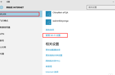 3、在wlan选项中找到管理wifi设置,打开