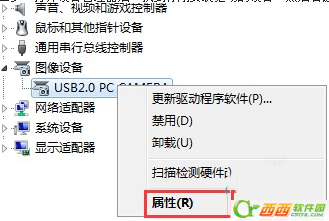 2、打开设备管理器后,找到你刚安装驱动的设备,然后右键点击“属性”(下面以摄像头为例,其他设备操作相同)