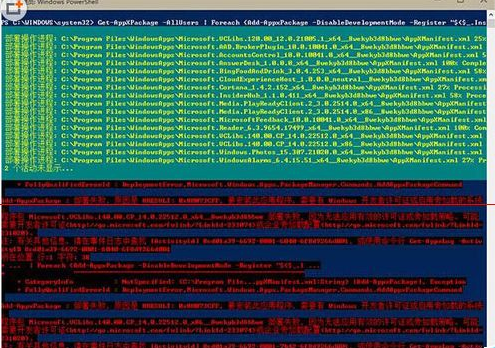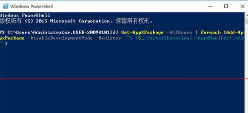 2、输入如下命令后回车:Get-AppXPackage -AllUsers | Foreach {Add-AppxPackage -DisableDevelopmentMode -Register “$($_.InstallLocation)AppXManifest.xml”}
