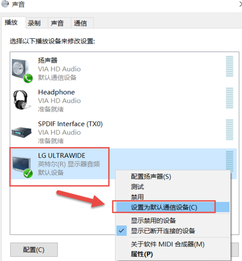 2、选择外接显示器的音箱设置,点击右键选择“设置为默认通信设备”即可。