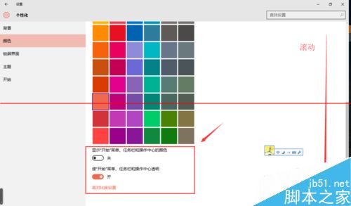 4、更多的颜色设置,可滚动界面,按照个人喜好调整。个人建议将“开始菜单、任务栏和操作中心透明”勾选上。这样看起来更美观。